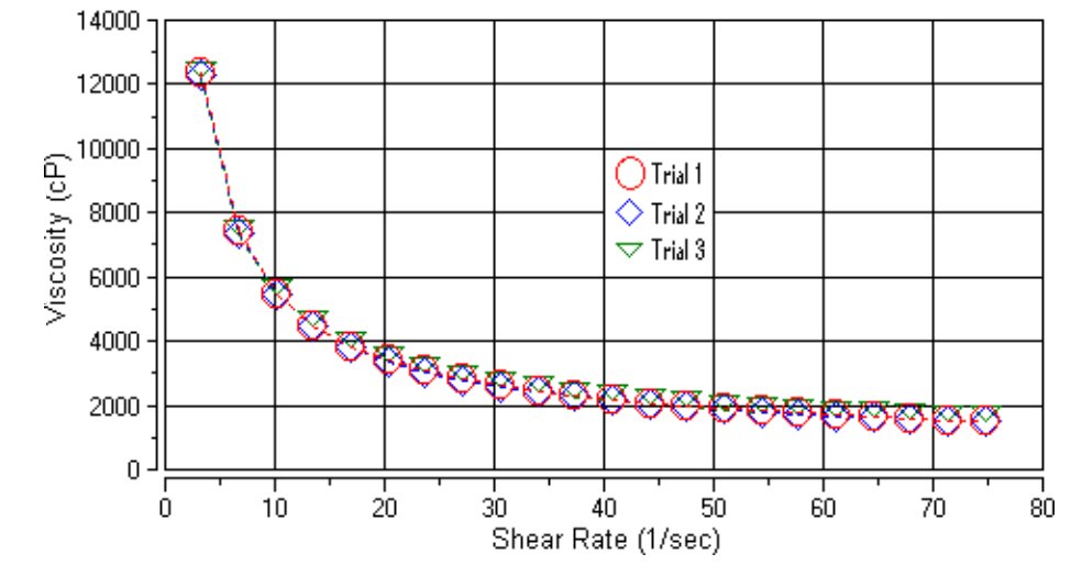 Utilizamos un reómetro Brookfield DV3THB con software Rheocalc™ para el control automatizado de instrumentos y la adquisición de datos. Realizamos nuestra prueba a temperatura ambiente (70-72°F) en un vaso de precipitados de 600 ml. Utilizamos un husillo HB-3 sumergido hasta su marca de inmersión. Se realizaron tres pruebas para garantizar la repetibilidad. Cada ensayo se realizó en una nueva porción de la muestra. Los datos representativos de los análisis se muestran en la Figura 1, que muestra que la viscosidad del detergente para lavavajillas disminuyó a medida que aumentó la velocidad de corte. Este comportamiento se conoce como “adelgazamiento por cizallamiento.” Los resultados en el rango de velocidades de corte fueron todos a escala entre el 10 y el 100% del torque en el rango de escala completa. Tenga en cuenta que las tres curvas se encuentran una encima de la otra, lo que muestra una excelente repetibilidad.