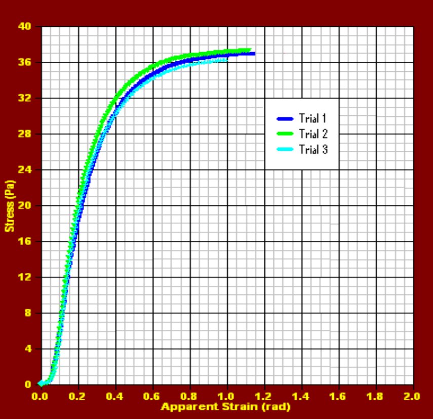 Utilizamos el reómetro Brookfield DV3TRV, con software EZ-Yield™ para el control automatizado de instrumentos y la adquisición de datos. Las pruebas de límite elástico determinan la tensión que se debe aplicar para hacer fluir un material. La deformación por fluencia aparente correspondiente es la deformación en la que la estructura de la muestra se descompone y comienza a fluir. La muestra se extrajo de su frasco y se colocó en un vaso de precipitados de 250 ml, donde se analizó. El husillo Vane se sumergió hasta su marca de inmersión primaria. El husillo Vane se sumergió en una nueva porción de la muestra para cada prueba. La figura 3 muestra la tensión (Pa) frente a la deformación aparente (rad) del detergente para lavavajillas a 1 RPM. La rigidez o firmeza del material se refleja en la pendiente o inclinación de la curva tensión-deformación. El límite elástico es la tensión máxima (alrededor de 37 Pa) en cada ejecución. Los resultados fueron repetibles.