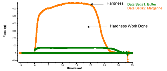 La Figura I muestra la fuerza de corte de un bloque de mantequilla y margarina de 5 cm x 3 cm probado a temperatura ambiente.  El pico máximo en el gráfico es una medida de la dureza de la muestra.  El área bajo el gráfico de carga versus tiempo desde el inicio de la prueba hasta el punto máximo es una medida del trabajo de dureza realizado.
